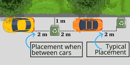 Blue and green bins should be placed one metre from the curb and at least 2 metres from a parked car.