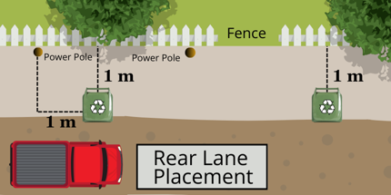 Blue and green bins need to be placed one metre away from fences, garages, power poles and overhanging trees.