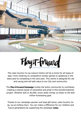 The Lake Country Co-op Leisure Centre will be a home for all types of play—from cheering on competitive hockey games to splashing in the wave pool to competing in the lane pool. This centre is designed for old and young and will add value to our City and our community.